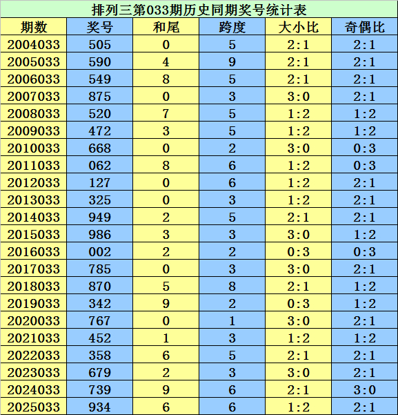 从2004年至今排列三已开出7507期奖号了,本期为排列三2026年第033期开奖,历史同期已出现22次奖号: