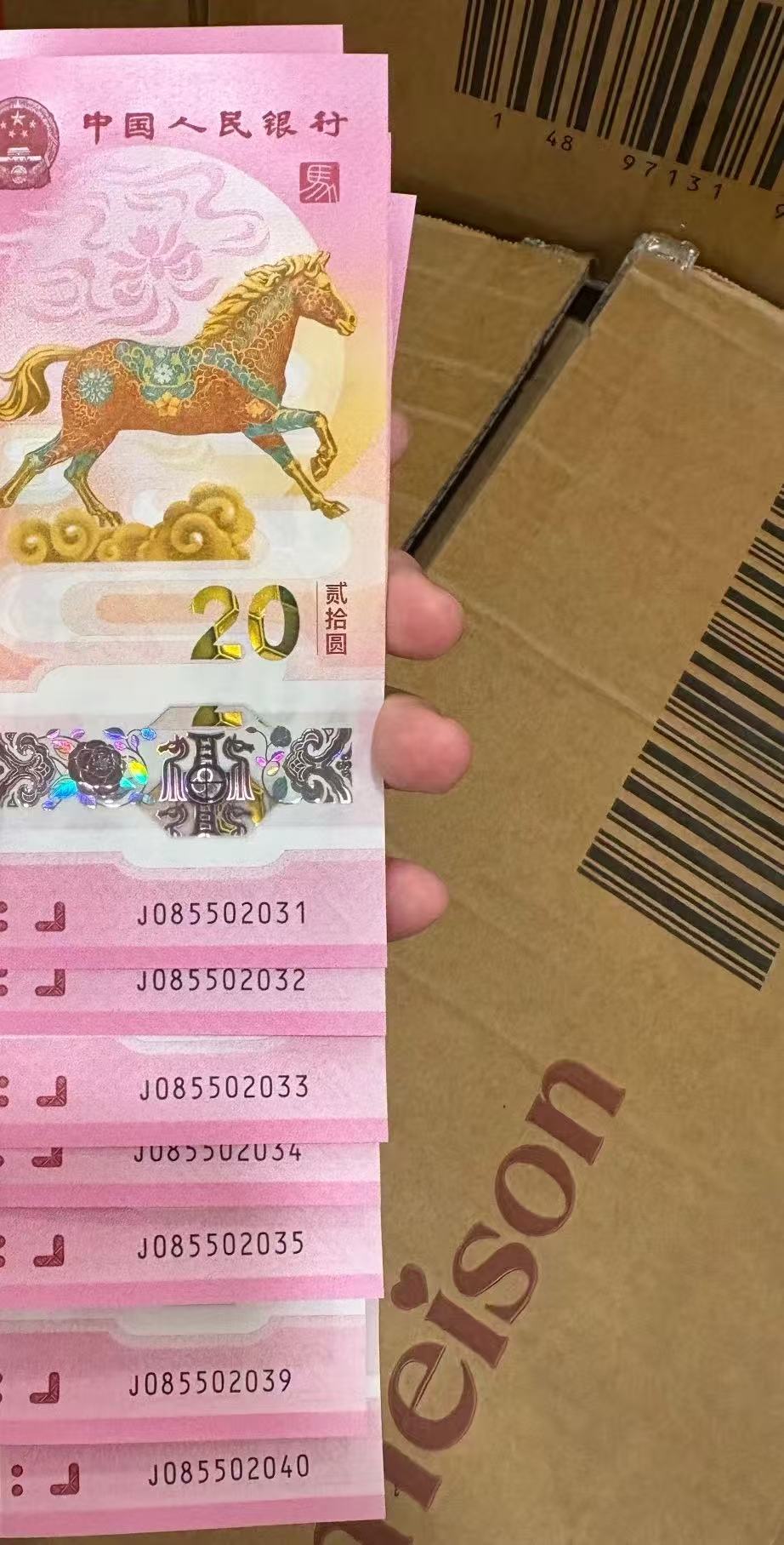 “我一开始也没觉得这套马钞有什么特别。”1月22日,来自广西南宁的七先生(化名)告诉记者,自己持有的是一套20连号纪念钞,编号从J085502021至J085502040,通过正常渠道兑换,成本400元。