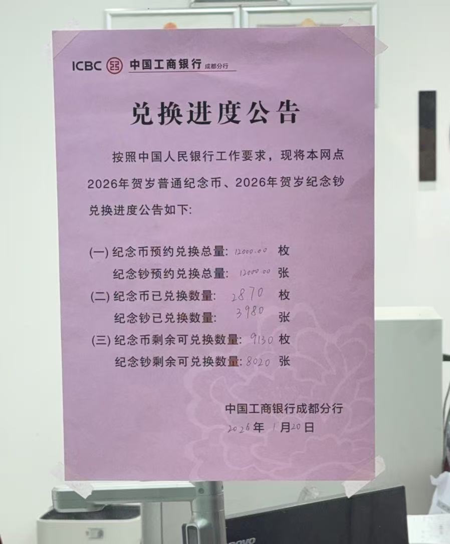 围绕马钞的热度,在兑换端已有直观体现。记者近日实地走访中国工商银行成都分行了解到,兑换首日,该网点2026年贺岁纪念钞和纪念币各12000张(枚)均已兑完,市场需求十分火爆。为应对集中兑换,网点设立专门窗口,现场节奏明显加快。