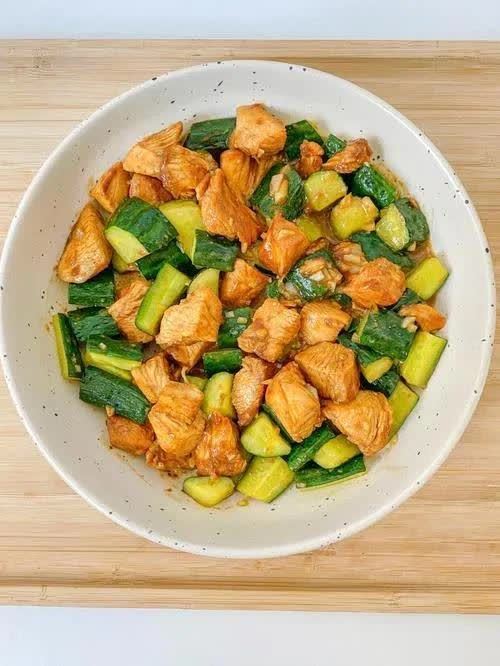 4、再次起锅烧油,油热后放入蒜末炒香,再放入黄瓜丁翻炒一会儿,炒至断生后放入鸡胸肉,加入蚝油和胡椒粉调味,翻炒均匀炒至入味即可出锅装盘开吃。