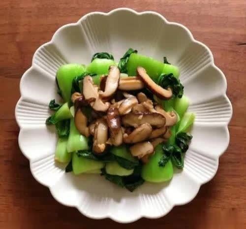 3、起锅烧油,油热后放入蒜片炒香,再放入香菇翻炒均匀,炒软后放入油菜翻炒均匀。