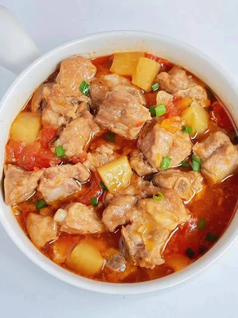 准备食材:排骨,番茄,姜片,葱段,葱花。
