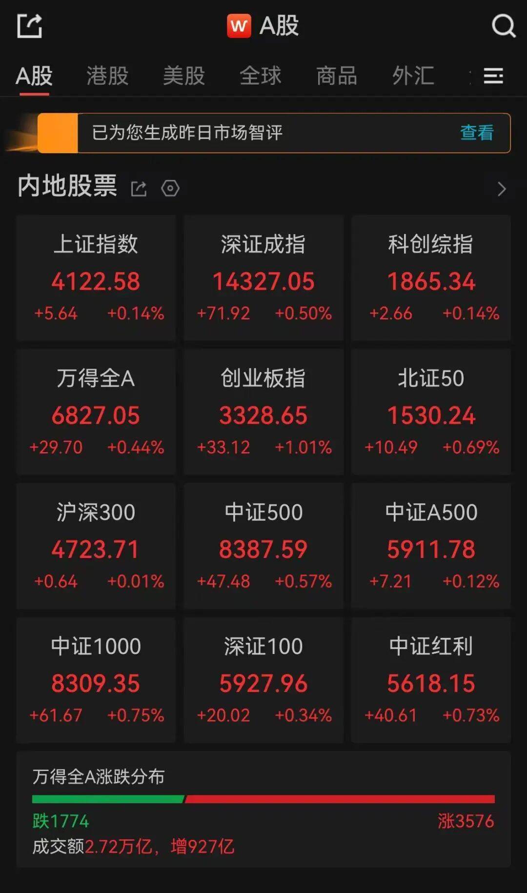 此外,油气、燃气概念股延续强势,半导体板块高开低走,贵金属、保险、医药等板块跌幅居前。全市场超3500只个股上涨。